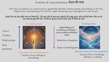 By the end of the day, as we prepare for sleep, another fascinating part of the journey begins. Consciousness starts to travel backward, moving from the vastness of infinity toward nothingness. As we prepare to rest, we ready ourselves to experience the second wave of consciousness, transitioning into the stillness once again.